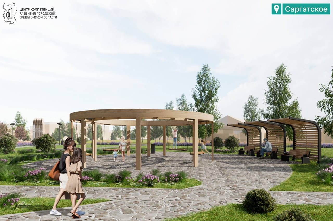 В зоне отдыха установят навесы, стилизованные элементами саргатской археологической культуры, а круглые качели-хоровод станут символом единства культур и традиций, а также напомнят жителям о том, что в посёлок приезжали переселенцы из разных уголков.